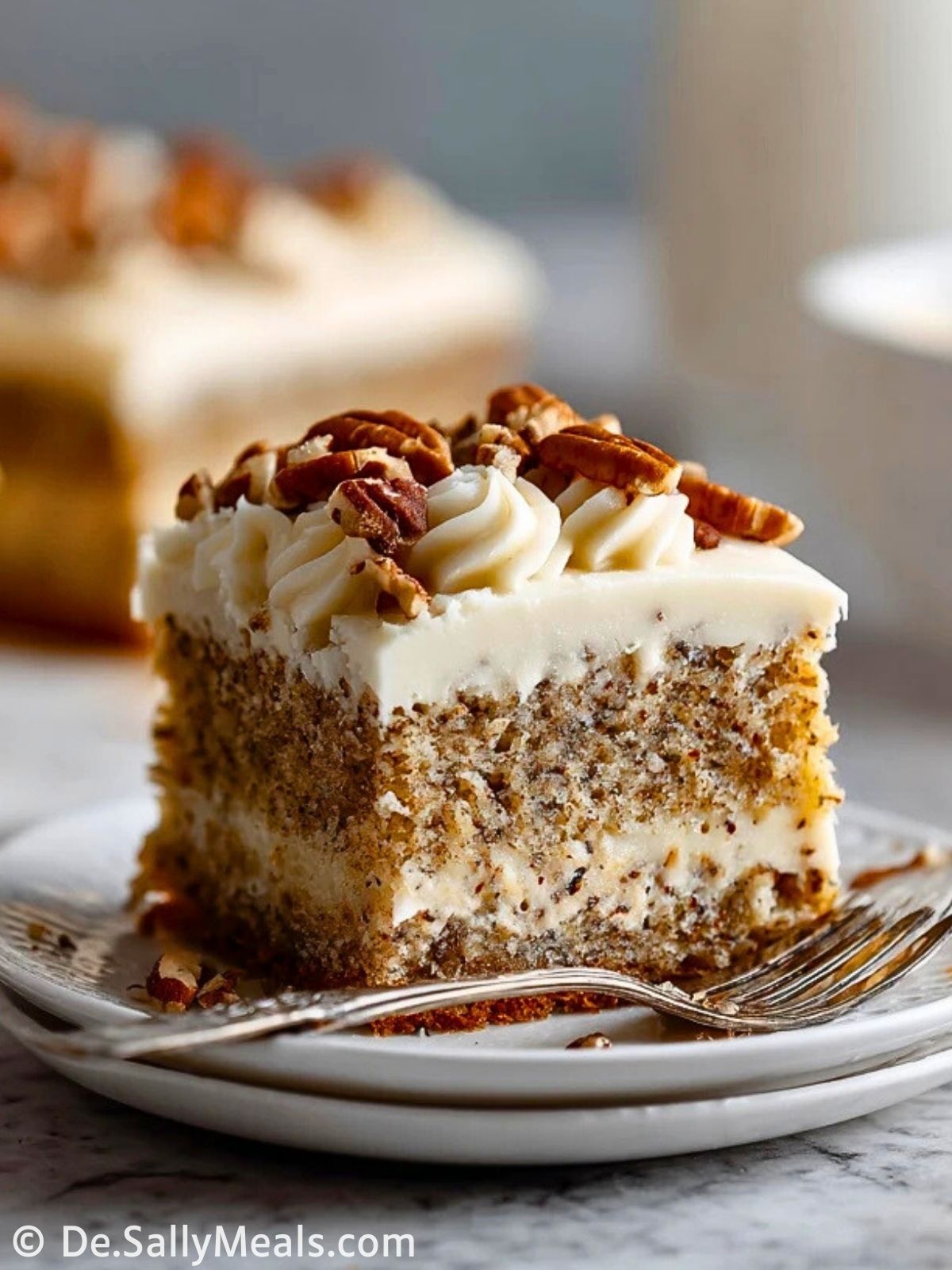 10. Das Frosting auf dem kalten Kuchen verstreichen und mit gehackten Pekannüssen bestreuen.