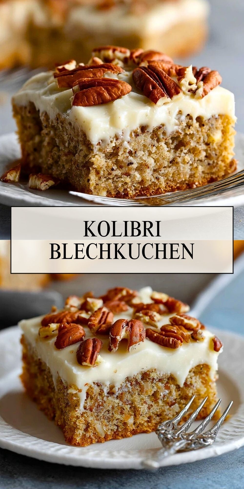 Ein saftiger Kolibri-Blechkuchen mit Banane, Ananas und Pekannüssen, getoppt mit cremigem Frischkäse-Frosting. Perfekt für Geburtstage, Kaffeerunden und alle Tage, an denen ein besonders aromatischer Blechkuchen gefragt ist.