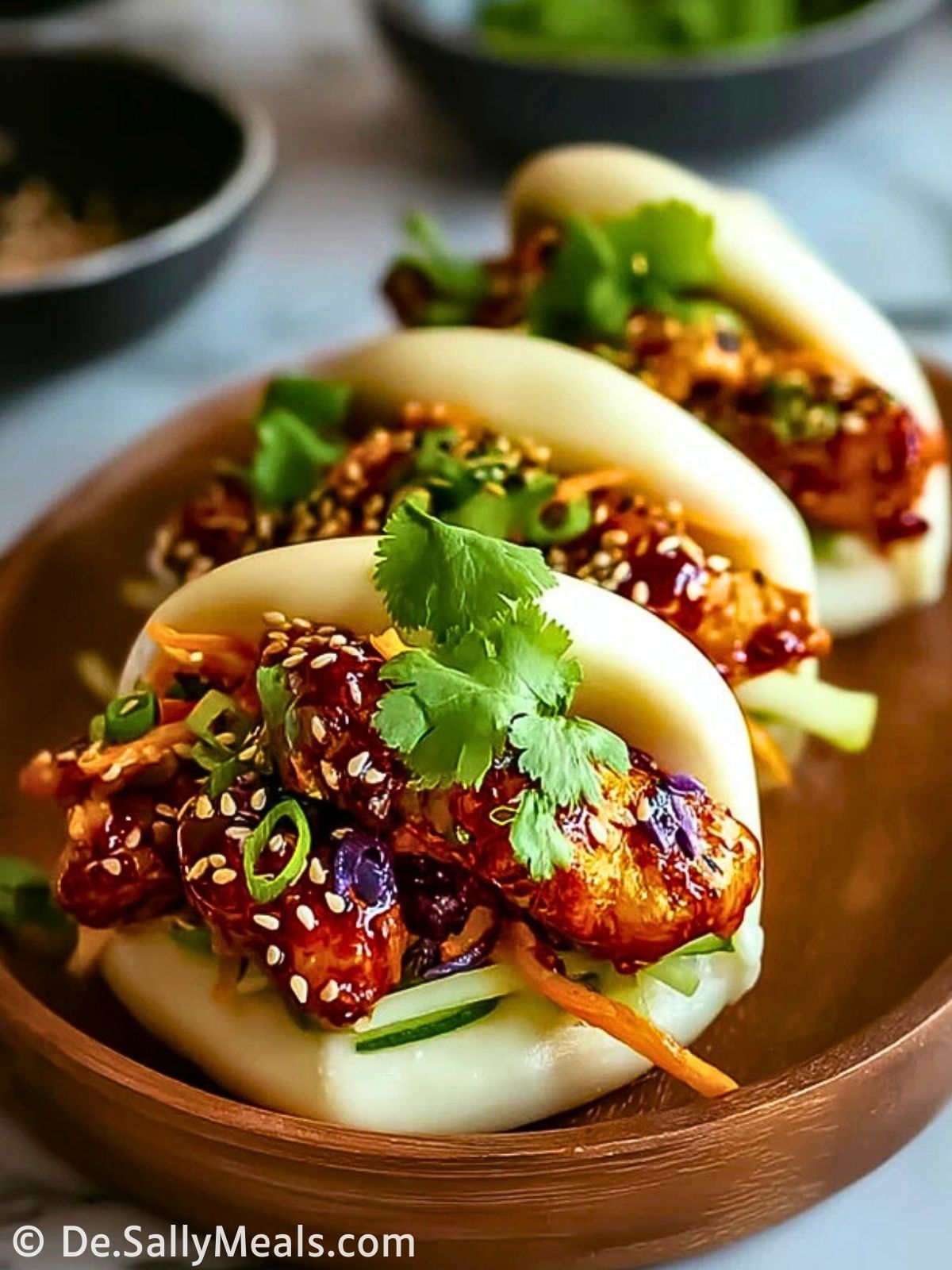 Öffne jedes Bao-Brötchen vorsichtig und fülle zuerst etwas Gurke, Karotte und Rotkohl hinein. Lege dann das glasierte Hähnchen darauf. Bestreue alles mit Sesam, Frühlingszwiebeln und frischem Koriander. Sofort servieren, damit die Brötchen ihre zarte Konsistenz behalten.