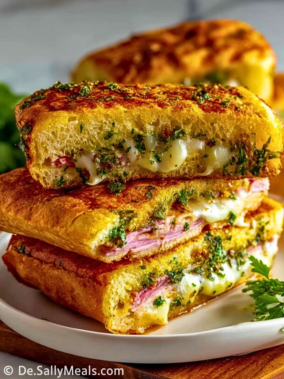 Dieses Rezept eignet sich perfekt als schnelles Mittagessen, als Snack für Gäste oder als wärmendes Abendessen, das alle am Tisch begeistert. Die Mischung aus buttrigem Knoblauch, herzhaftem Schinken und Fäden von geschmolzenem Käse macht diese Sandwiches unwiderstehlich. Egal ob frisch aus der Pfanne oder später kurz im Ofen aufgebacken – sie bleiben ein Genuss.