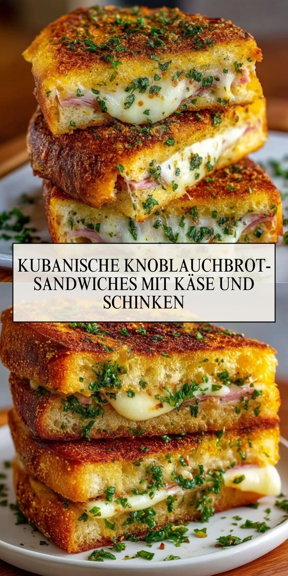 Stell dir vor: Knuspriges, goldbraun gebratenes Brot, durchzogen von würzigem Knoblauch und frischen Kräutern, gefüllt mit zartem Schinken und herrlich geschmolzenem Käse. Genau das bieten diese kubanisch inspirierten Knoblauchbrot-Sandwiches. Sie sind außen knusprig, innen saftig – ein echtes Comfort Food mit dem gewissen Etwas.