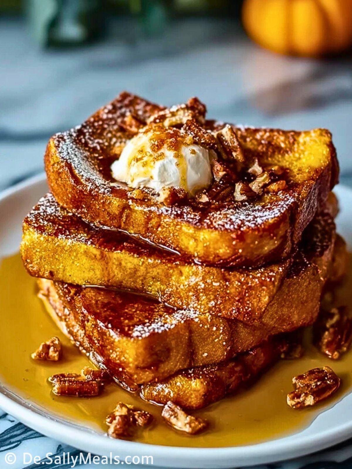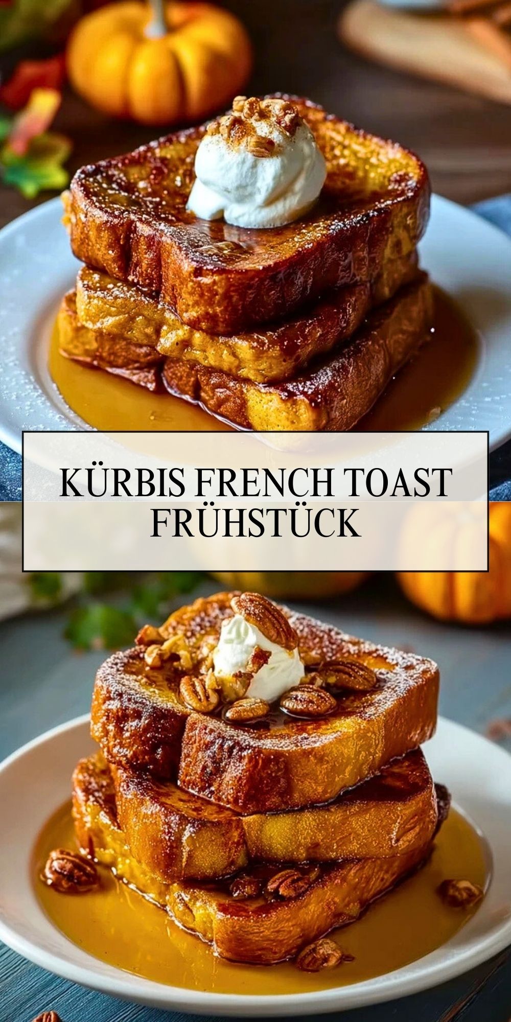 Goldbraun gebratener French Toast mit aromatischem Kürbispüree und herbstlichen Gewürzen, getoppt mit Butter und Ahornsirup – das perfekte Frühstück für gemütliche Tage!