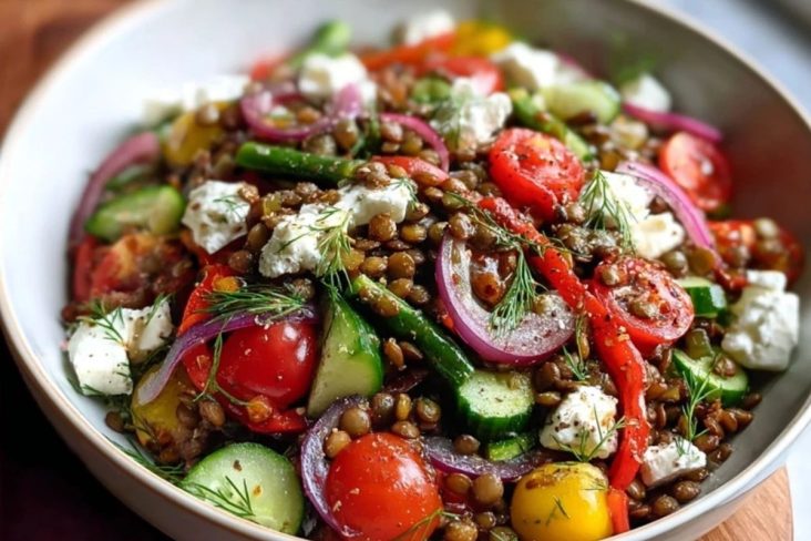 Mediterraner Linsensalat mit Protein ist die ideale Wahl, wenn du ein frisches, sättigendes und alltagstaugliches Gericht suchst. Zarte Linsen treffen auf knackiges Gemüse, würzigen Feta, feine Kräuter und ein aromatisches Dressing, das alles wunderbar verbindet. Das Ergebnis ist ein Salat, der leicht wirkt und trotzdem richtig Substanz hat.
