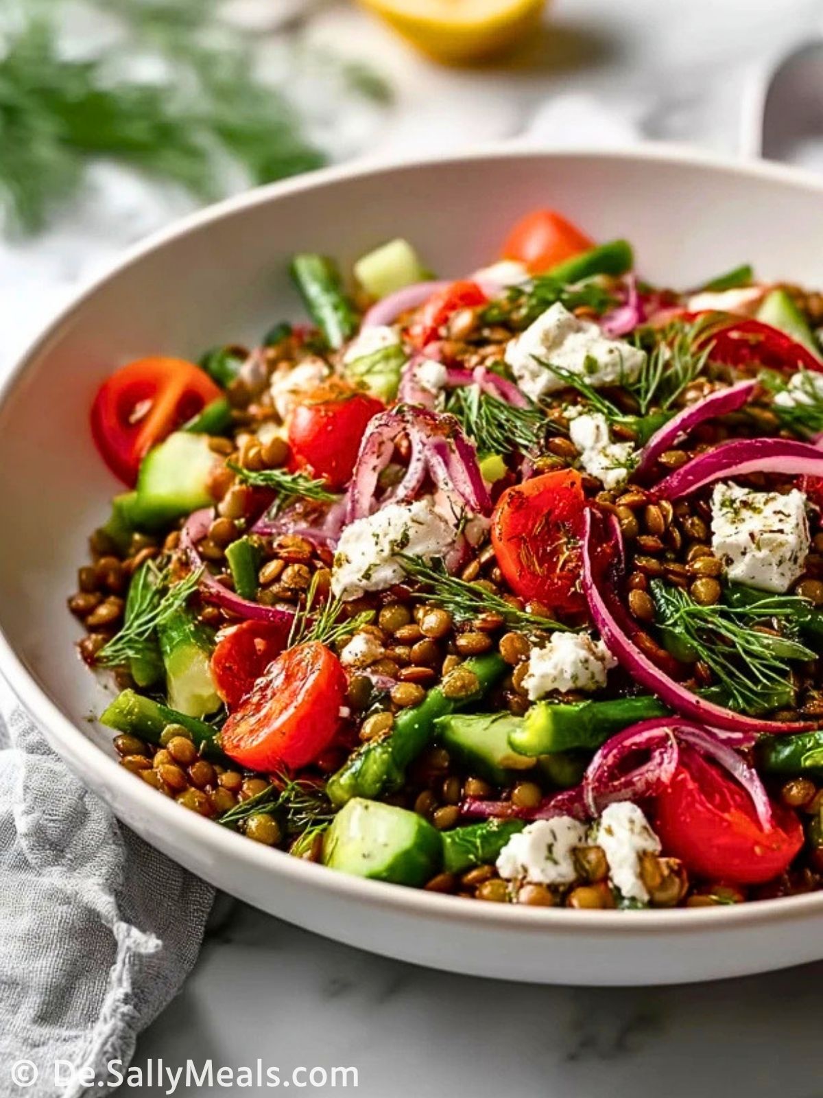 Dieser Linsensalat schmeckt leicht gekühlt oder bei Zimmertemperatur besonders gut. Du kannst ihn als eigenständiges Mittagessen servieren, zu gegrilltem Gemüse reichen oder als frische Beilage auf ein Buffet stellen. Auch in Lunchboxen macht er sich hervorragend, weil er nicht so schnell zusammenfällt wie grüne Blattsalate.