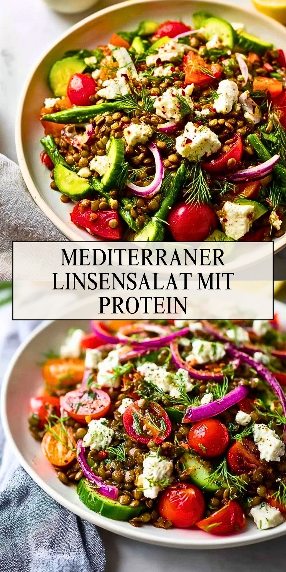 Dieser Mediterrane Linsensalat mit Protein ist frisch, aromatisch und wunderbar sättigend. Bissfeste Linsen werden mit knackiger Gurke, saftigen Tomaten, roter Paprika, würzigem Feta und frischen Kräutern kombiniert. Ein einfaches Zitronen-Dressing mit Olivenöl und Knoblauch verbindet alle Zutaten zu einem ausgewogenen, mediterranen Salat, der sich perfekt für Mittagessen, Meal Prep oder als Beilage eignet.