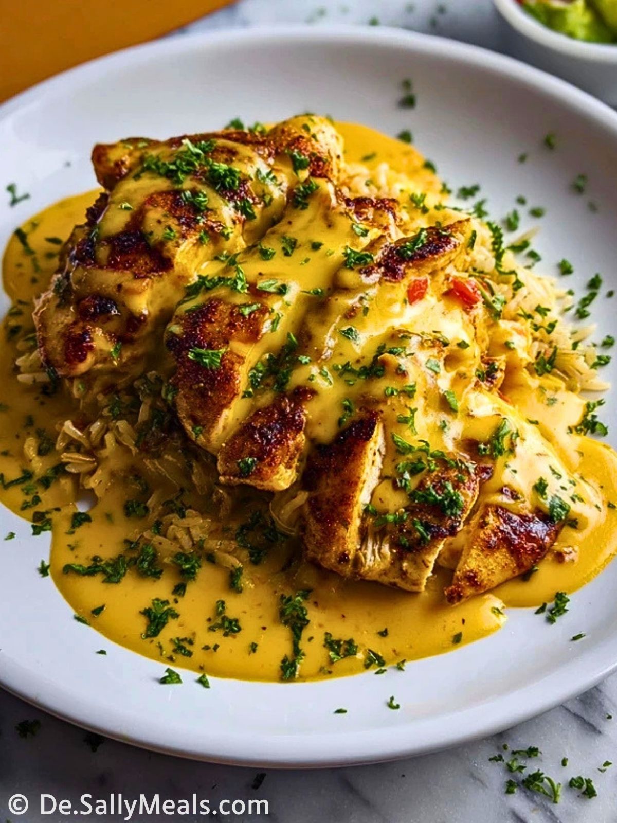 Schneide das Hähnchen in Scheiben und richte es auf dem warmen Reis an. Verteile die Käsesauce großzügig darüber und garniere alles mit gehacktem Koriander oder Petersilie. Dazu passen frische Tomaten und etwas Blattsalat.