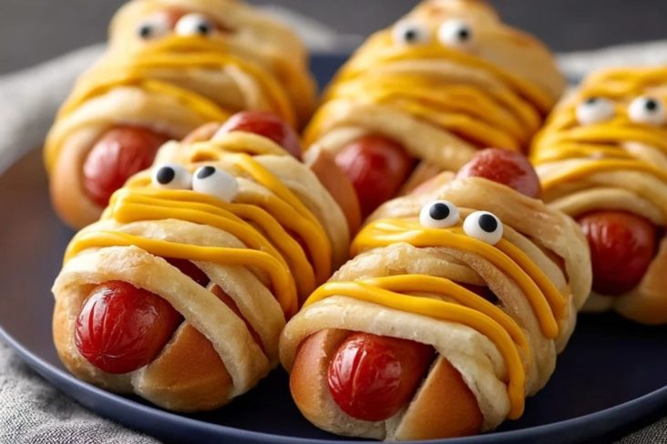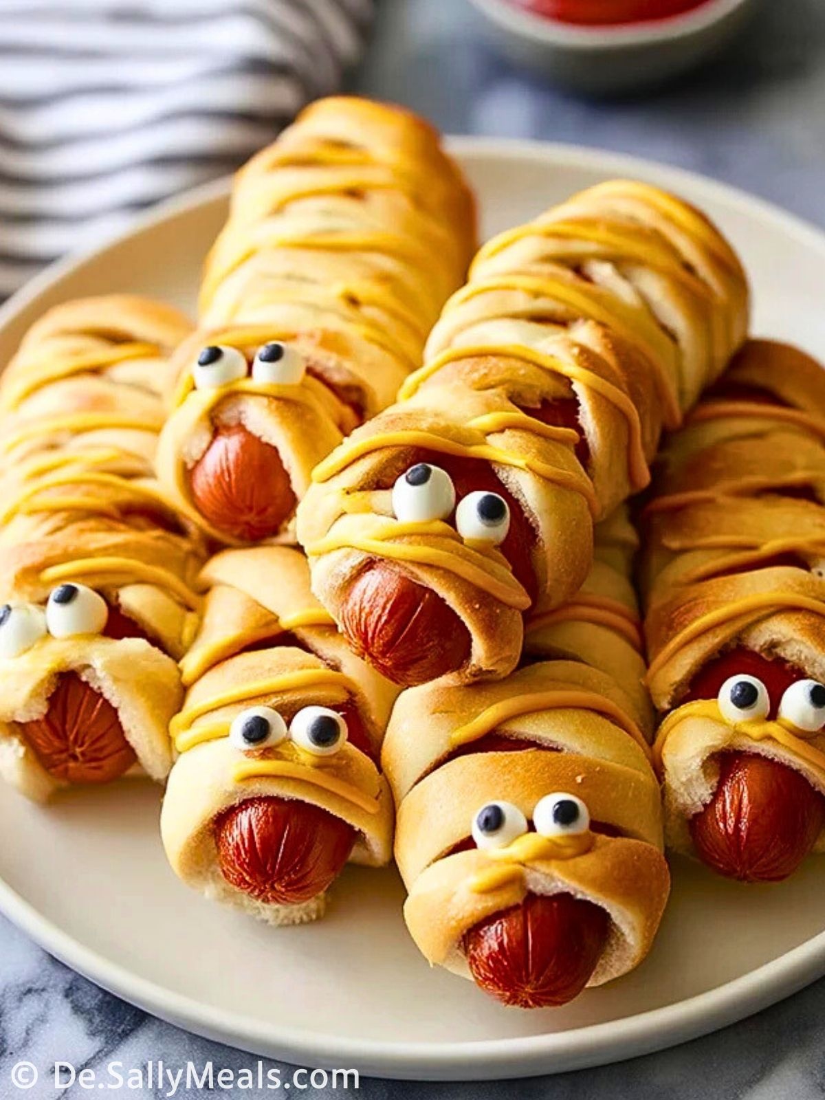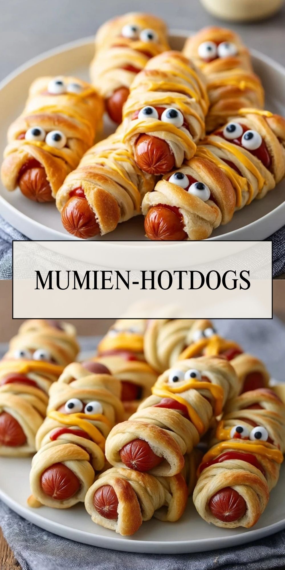 Ob als Partysnack, Kindergeburtstag oder einfach für einen lustigen Abend – Mumien-Hotdogs bringen Gruselspaß und Genuss auf den Teller. Die Kombination aus fluffigem Teig, saftigen Würstchen und einem Hauch Senf macht sie unwiderstehlich.