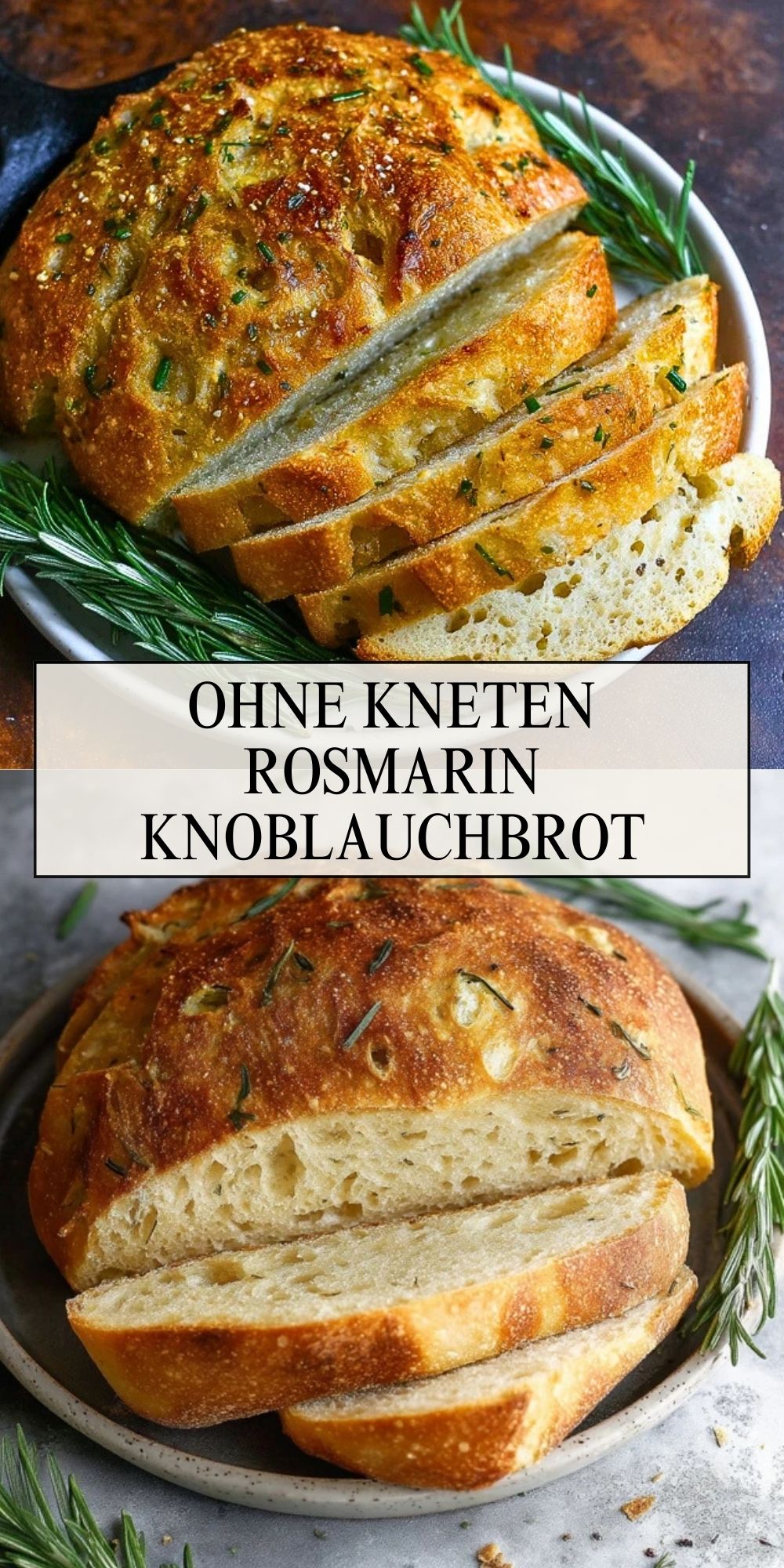 Dieses Ohne-Kneten Rosmarin-Knoblauchbrot ist außen goldbraun und knusprig, innen weich und luftig. Frischer Rosmarin, aromatischer Knoblauch und etwas Olivenöl machen es zu einem unkomplizierten, herzhaften Brot, das wunderbar zu Suppen, Salaten, Antipasti oder einfach mit Butter passt.