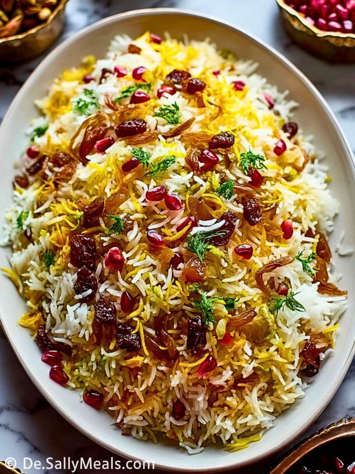 Den fertigen Reis vorsichtig auf eine Platte geben. Mit den restlichen Trockenfrüchten, Nüssen, Granatapfelkernen und karamellisierten Zwiebeln dekorieren. Mit Minze oder Petersilie garnieren und direkt servieren.