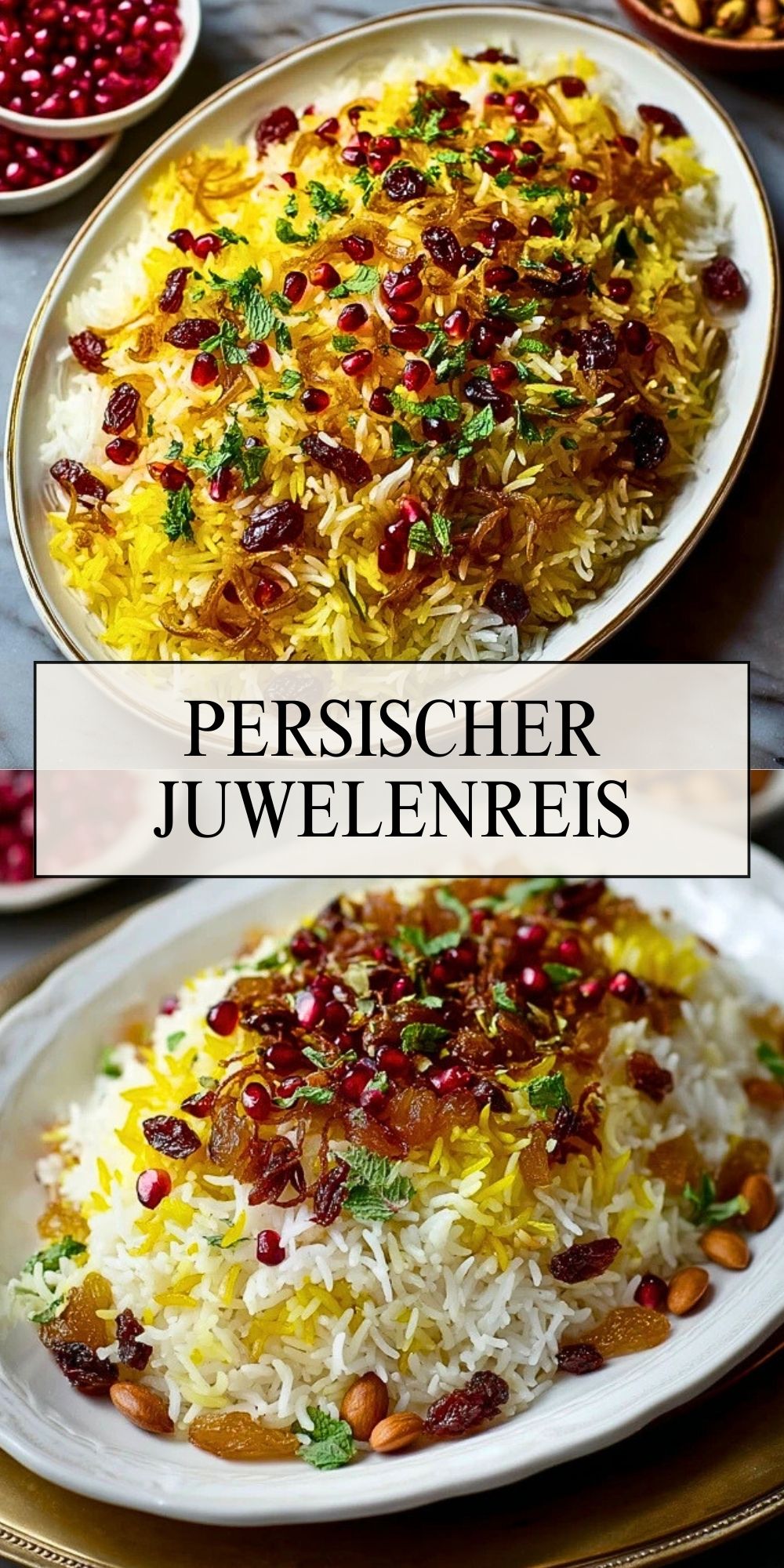 Persischer Juwelenreis (Javaher Polow) ist ein prachtvolles Reisgericht aus der persischen Küche. Duftender Basmatireis wird mit Safran, Orangenschale, gerösteten Nüssen, getrockneten Früchten und Granatapfelkernen kombiniert. Perfekt für festliche Anlässe, überzeugt dieses Gericht durch seine leuchtenden Farben und seinen fein ausbalancierten Geschmack aus süßen, nussigen und würzigen Noten.