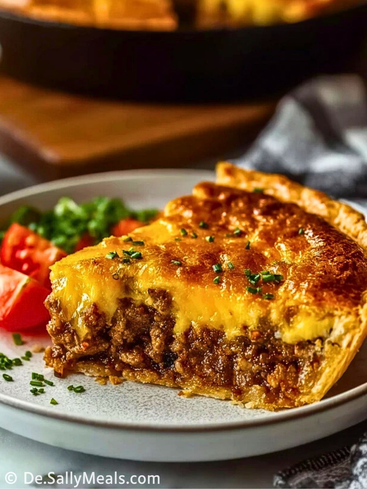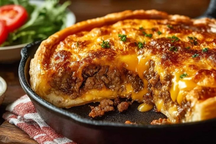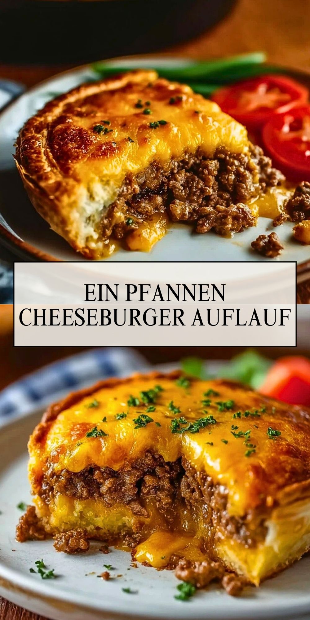 Ein herzhafter Pfannen Cheeseburger Auflauf mit würzigem Rinderhack, geschmolzenem Cheddar und goldbrauner Teigdecke. Perfekt für ein sättigendes Familienessen, das klassische Burger-Aromen in Auflauf-Form auf den Tisch bringt.