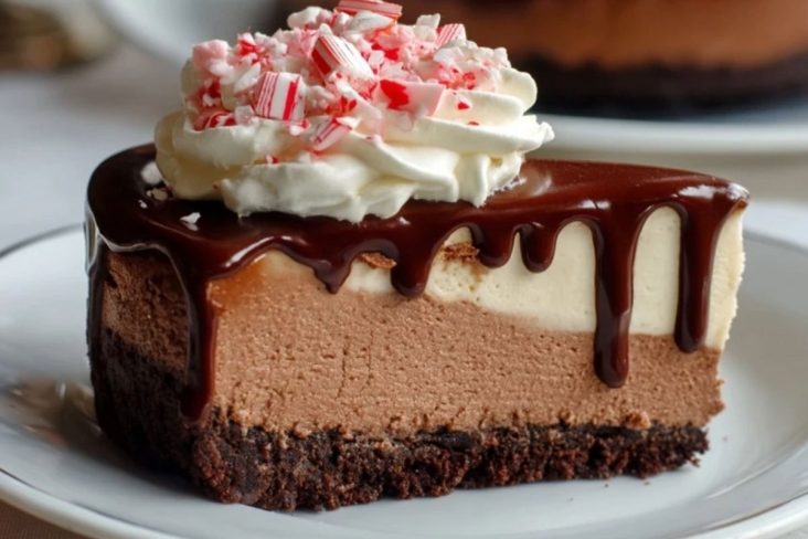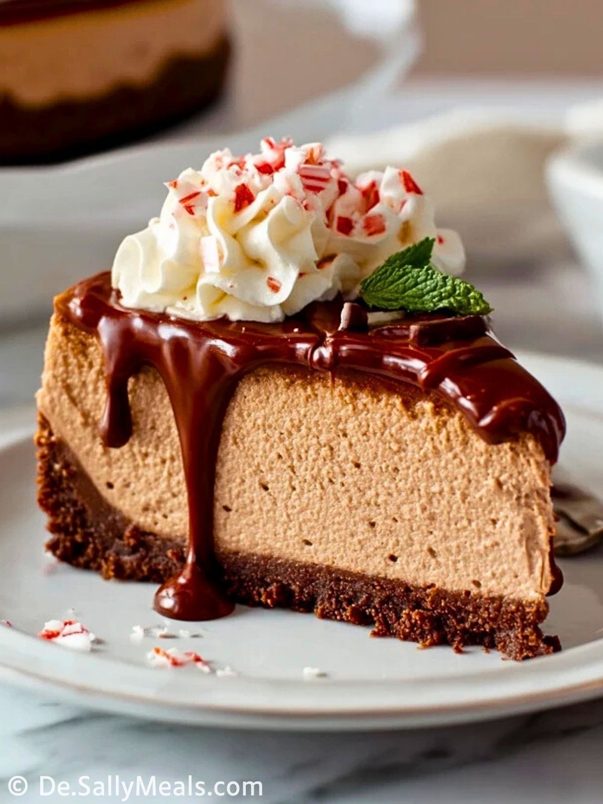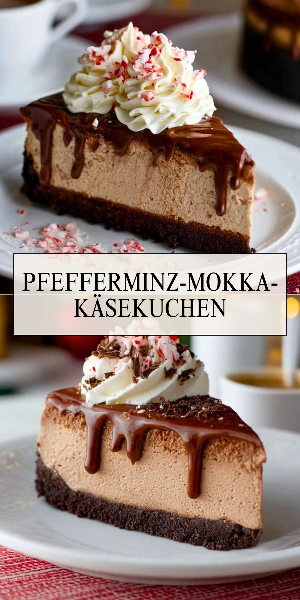 Dieser Pfefferminz-Mokka-Käsekuchen vereint einen intensiven Schokoladenkeksboden, cremige Mokka- und Vanille-Frischkäse-Schichten, eine glänzende Schokoganache und knusprige Pfefferminzstreusel zu einem festlichen Dessert, das perfekt für Weihnachten und alle besonderen Anlässe ist.