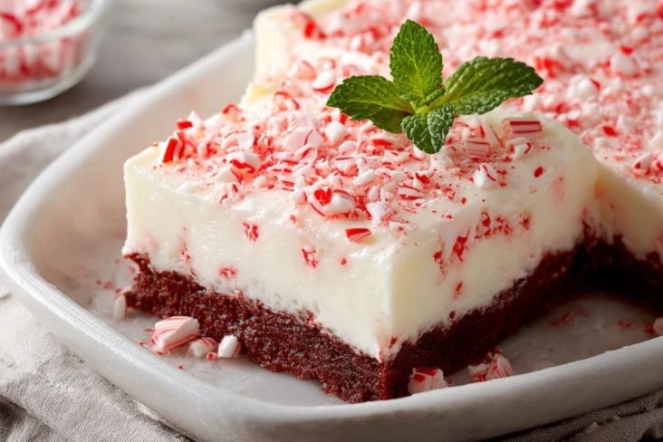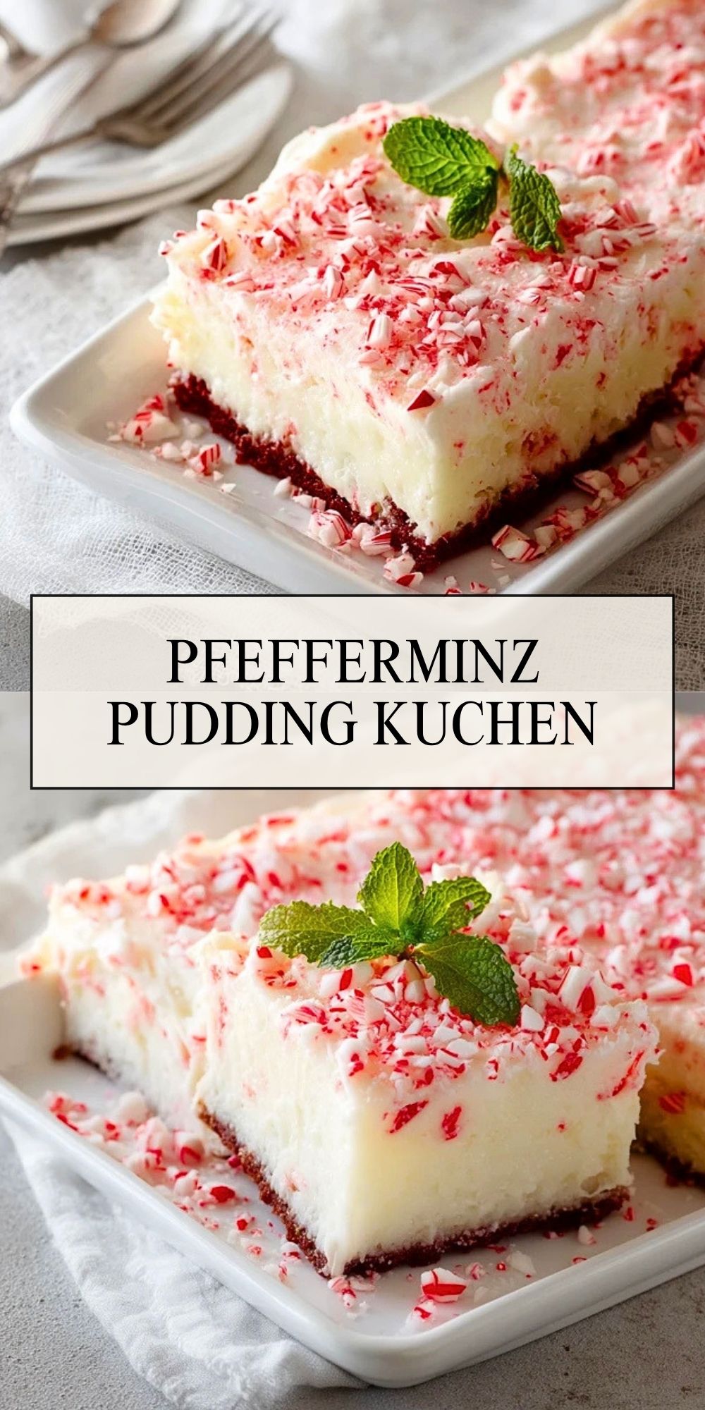Dieser Pfefferminz-Pudding-Kuchen verbindet einen saftigen Schokoladenboden mit einer cremigen, kühlen Puddingschicht und einer feinen Pfefferminznote. Zerstoßene Pfefferminzbonbons sorgen für einen hübschen Abschluss und geben dem Dessert einen frischen, festlichen Charakter.