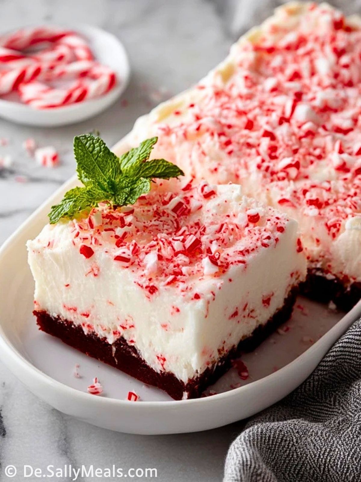 Bestreue die Oberfläche mit zerstoßenen Pfefferminzbonbons. Stelle den Kuchen für mindestens 4 Stunden, besser über Nacht, in den Kühlschrank, damit die Schichten fest werden und sich die Aromen verbinden.