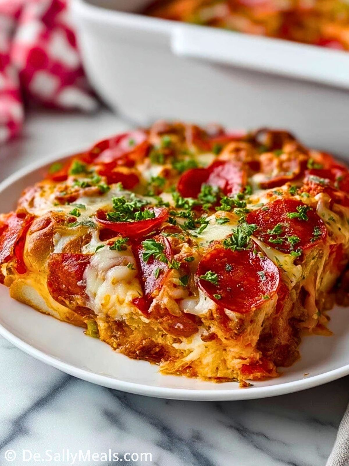 Am besten schmeckt der Pizza Auflauf frisch aus dem Ofen, wenn der Käse noch schön zerläuft. Dazu passt ein knackiger Salat oder ein frischer Kräuterdip. Reste lassen sich luftdicht verschlossen bis zu zwei Tage im Kühlschrank aufbewahren und im Ofen oder in der Mikrowelle wieder erwärmen.