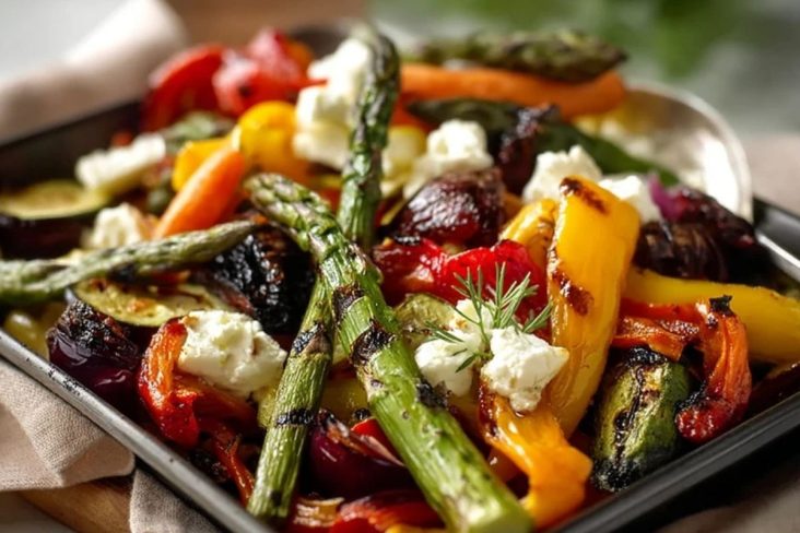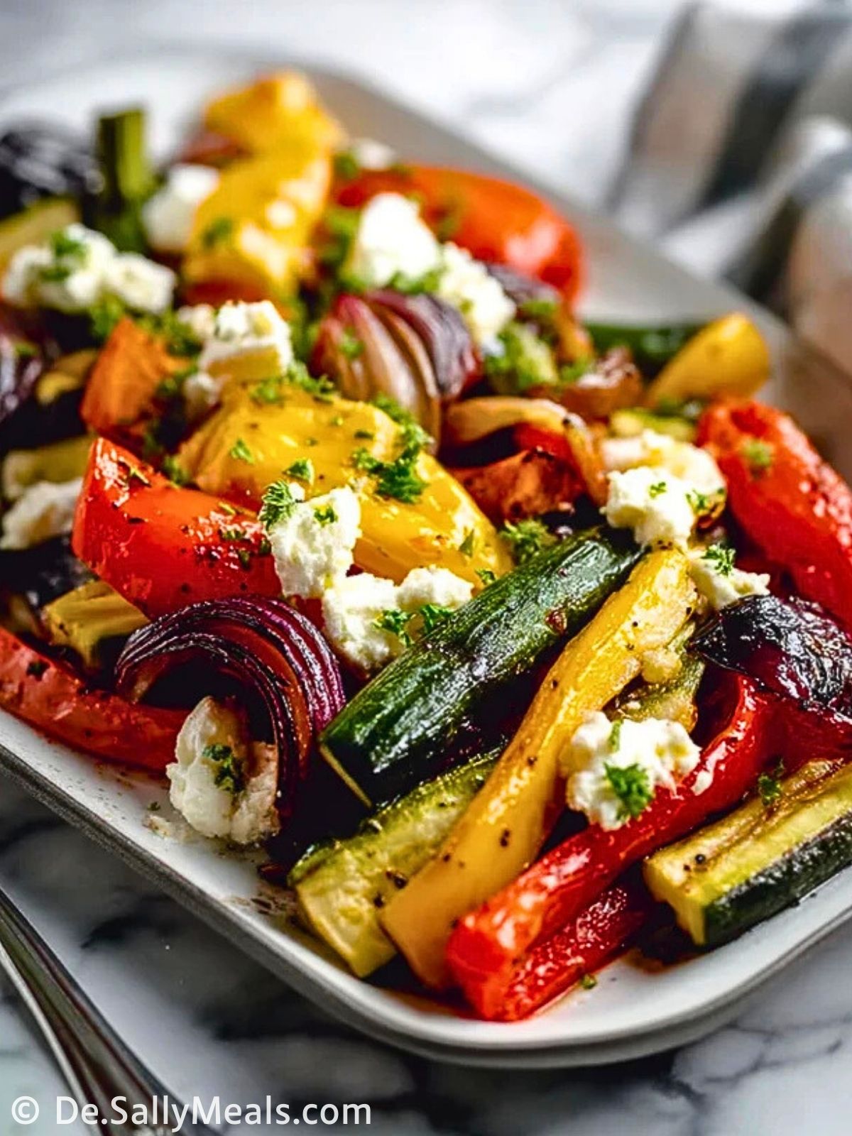 Geröstete bunte Gemüse im Ofen, mit cremigem Ziegenkäse und frischen Kräutern. Dieses einfache, aromatische Gericht bringt gesunde Vielfalt auf den Tisch – als Beilage oder vegetarisches Hauptgericht.