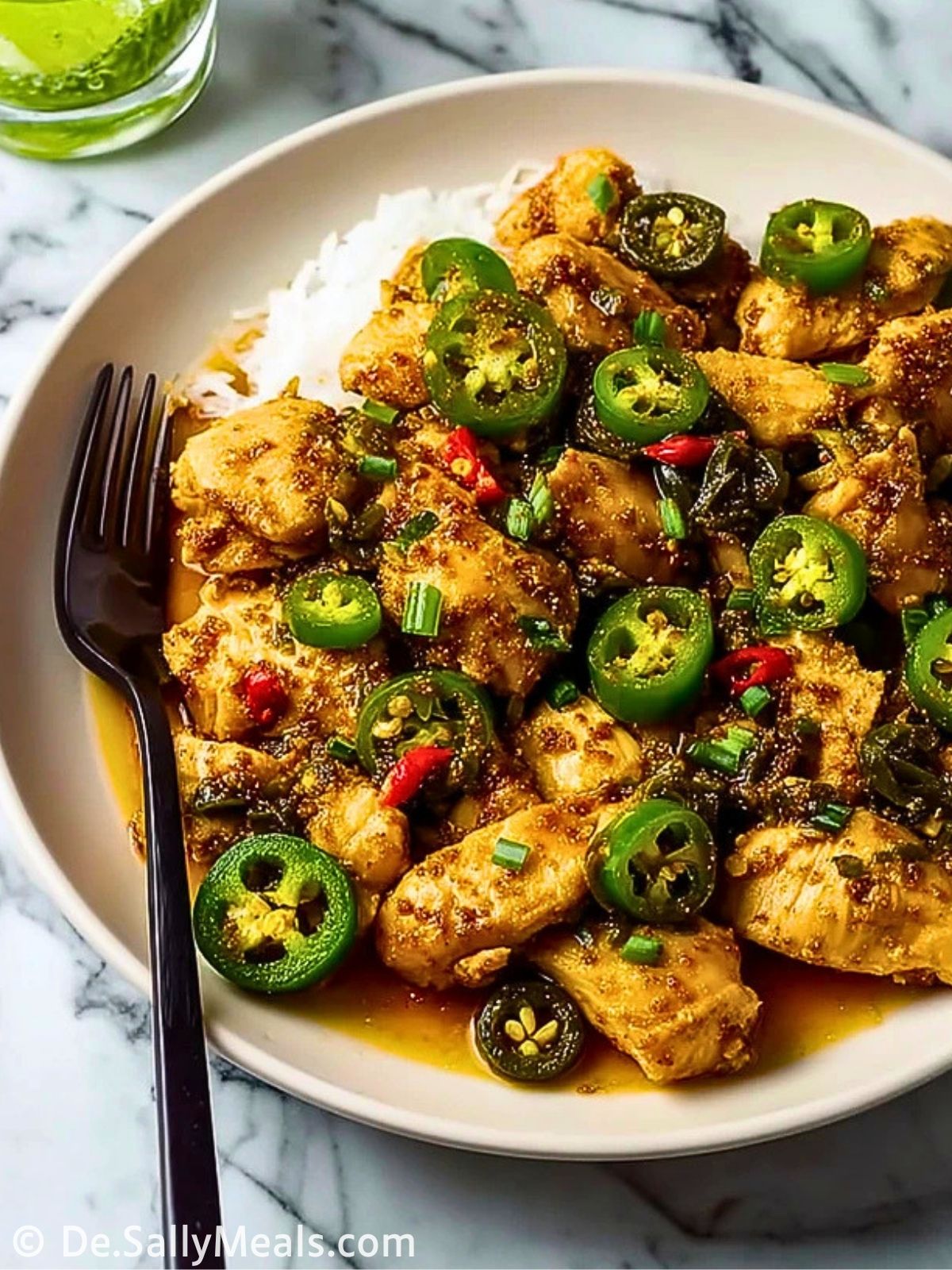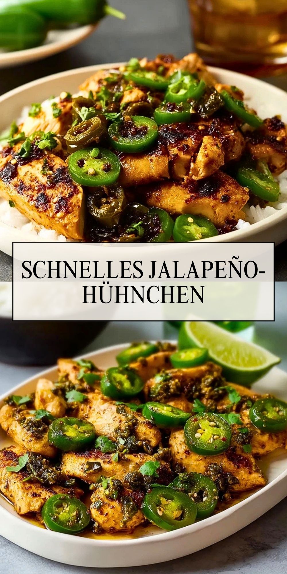 Verteile den Reis auf Teller oder Schalen und gib das Jalapeño-Hühnchen mitsamt Sauce darüber. Nach Wunsch mit frischer Limette servieren.