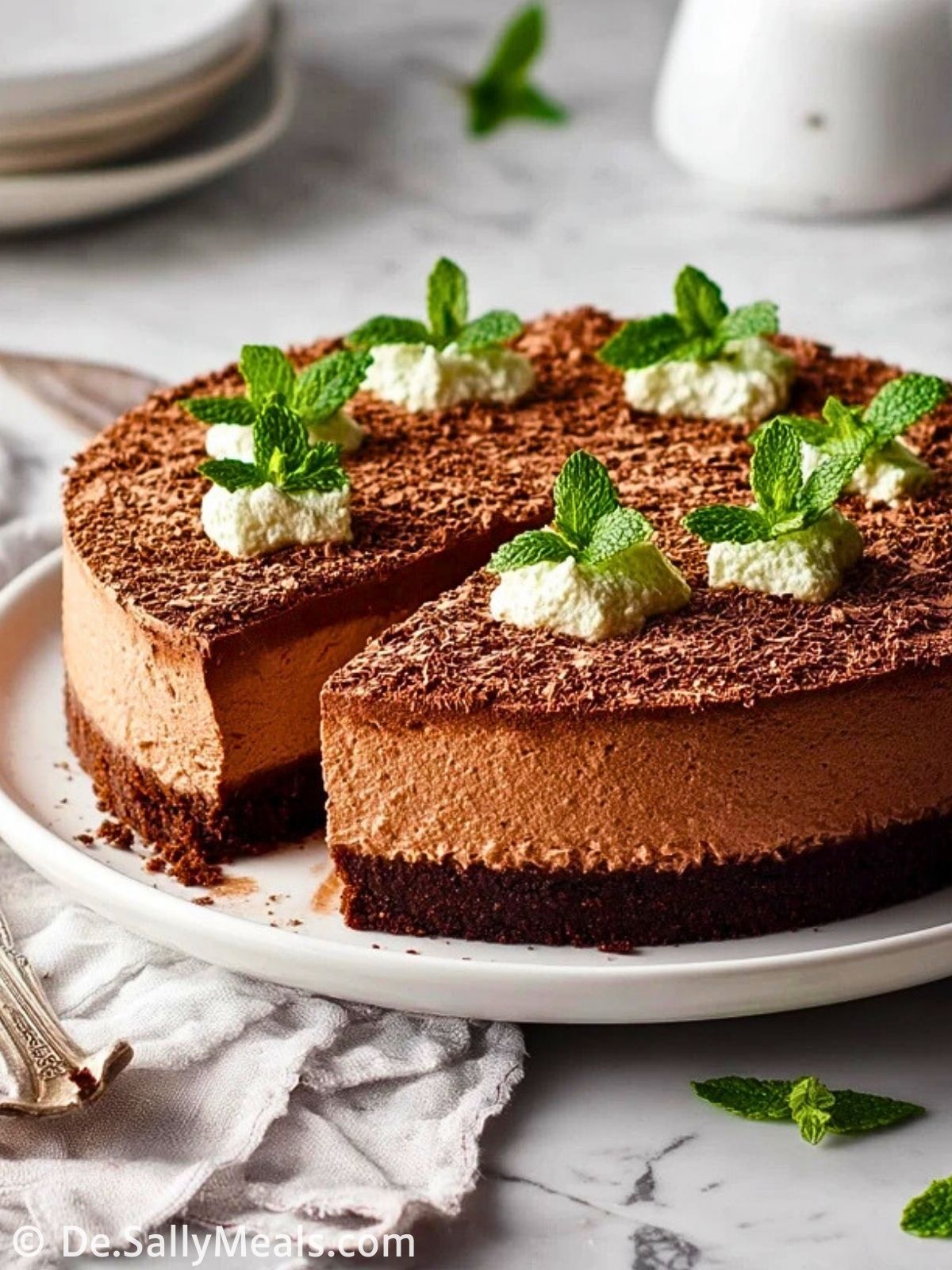 Diese Schokoladenmousse Torte mit Minze ist ein cremiger No-Bake-Kuchentraum mit schokoladigem Boden, luftiger Schokoladenmousse und einem Hauch Frische durch Minze. Perfekt für besondere Anlässe oder das Sonntagskaffee-Highlight!