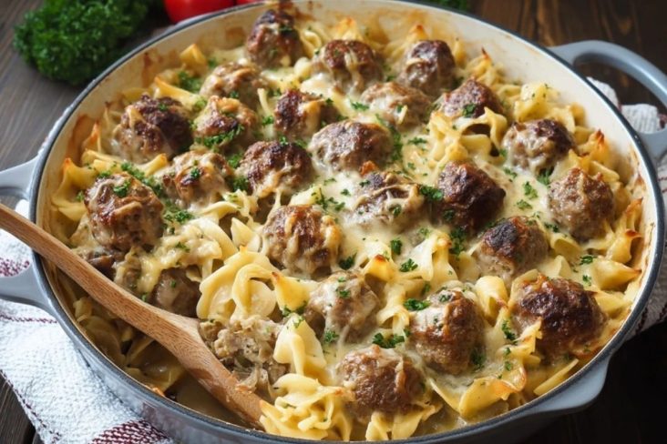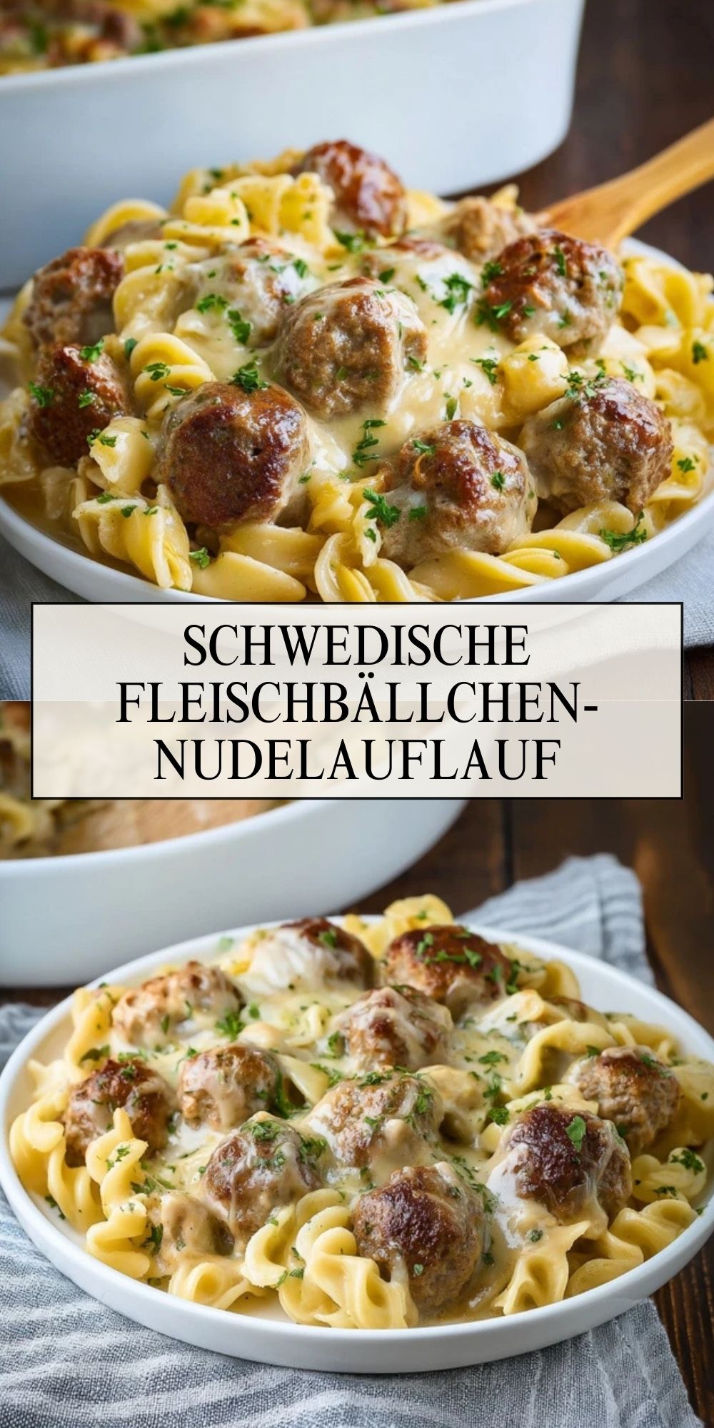 Herzhafter schwedischer Fleischbällchen-Nudelauflauf mit cremiger Sauce, zarten Hackbällchen und goldbrauner Käsekruste – ein Wohlfühlgericht für die ganze Familie!