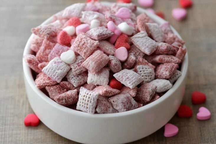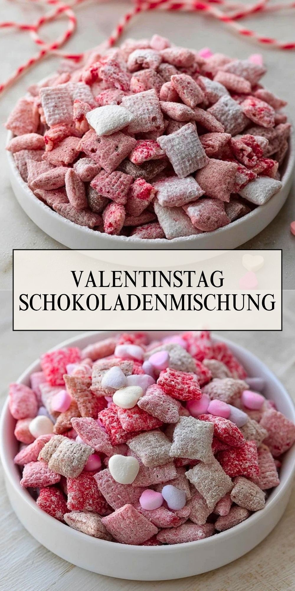 Rosa Candy Melts oder rosa Schokoladenglasur sorgen für den festlichen Valentinstags-Look und verleihen der Mischung zusätzliche Süße.