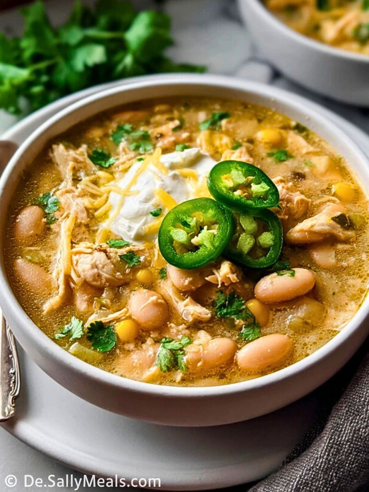 Cremige Weiße Hühner-Chili mit zartem Hähnchen, weißen Bohnen, Mais und milden grünen Chilis – ein herzhaftes Wohlfühlgericht, das schnell gemacht ist und wunderbar wärmend schmeckt.