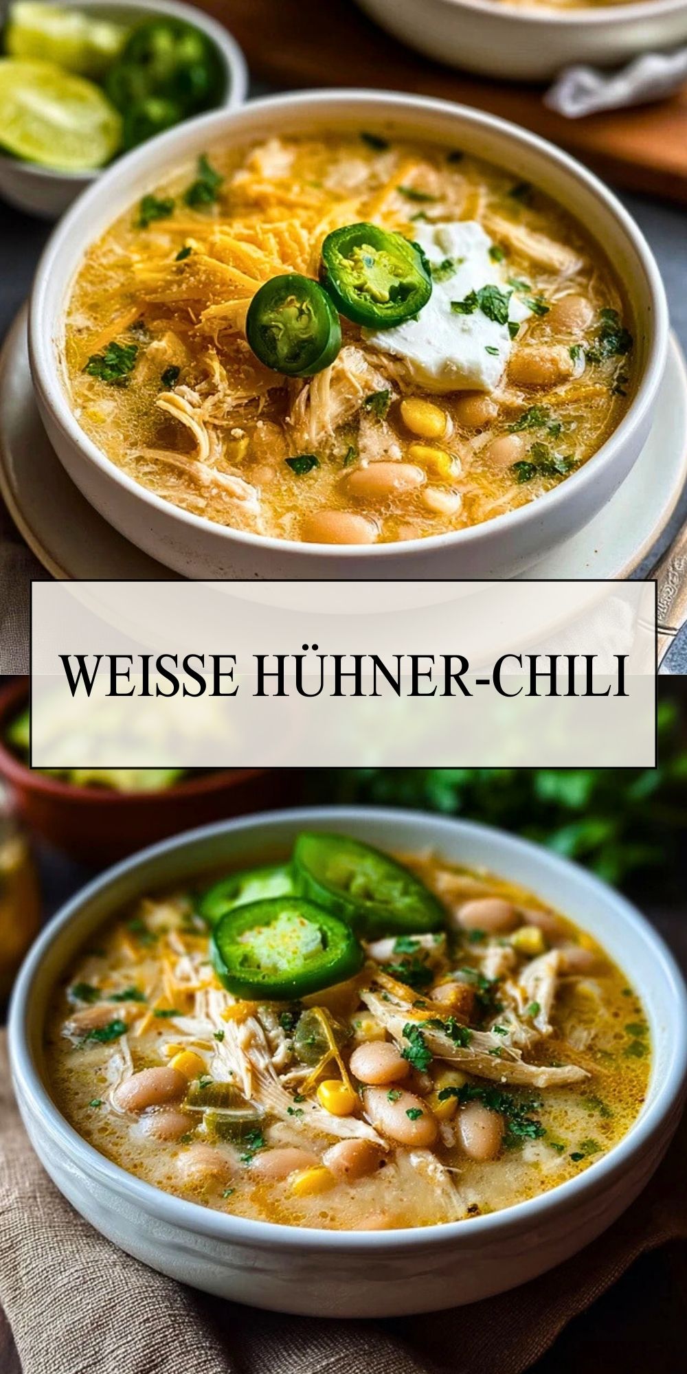 Weiße Hühner-Chili schmeckt frisch aus dem Topf besonders gut, wenn sie mit geriebenem Käse, Kräutern, Jalapeños oder sogar etwas Crème fraîche serviert wird. Dazu passen knuspriges Brot, Tortilla-Chips oder ein einfacher grüner Salat. Wenn du Gäste hast, kannst du verschiedene Toppings separat bereitstellen, damit sich jeder seine Schüssel nach Geschmack zusammenstellen kann.