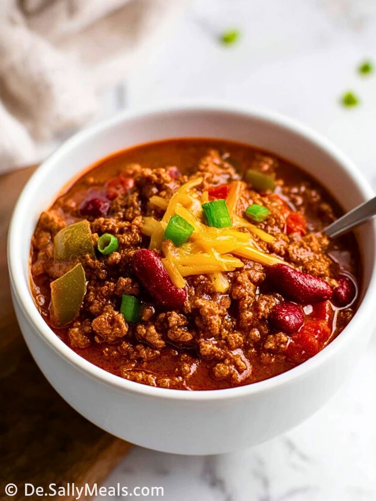 Eine herzhafte, würzige Chili-Nachahmung mit Rinderhack, Bohnen, Tomaten und Paprika, die wunderbar sättigt und sich ideal vorbereiten lässt. Mit Schmand, Cheddar und Frühlingszwiebeln serviert, schmeckt sie besonders aromatisch und angenehm cremig.