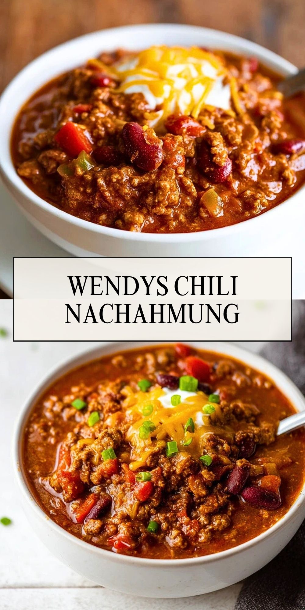 Wendys Chili Nachahmung schmeckt pur aus der Schüssel, mit frischem Brot, über Ofenkartoffeln oder zusammen mit Reis besonders gut. Für ein klassisches Chili-Erlebnis passen Toppings wie Schmand, geriebener Käse, Frühlingszwiebeln oder ein paar Jalapeños hervorragend dazu. Auch Tortilla-Chips sorgen für einen schönen Crunch.
