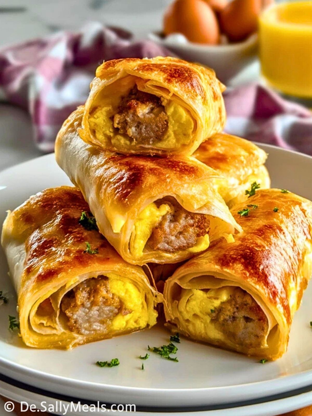 Herzhafte Wurst-Ei-Käse Frühstücks-Röllchen im knusprigen Blätterteig: Perfekt für ein gemütliches Frühstück, einen Brunch oder als Snack für unterwegs. Saftige Wurst, fluffiges Rührei und geschmolzener Käse machen diese Röllchen zu einem Favoriten am Frühstückstisch!