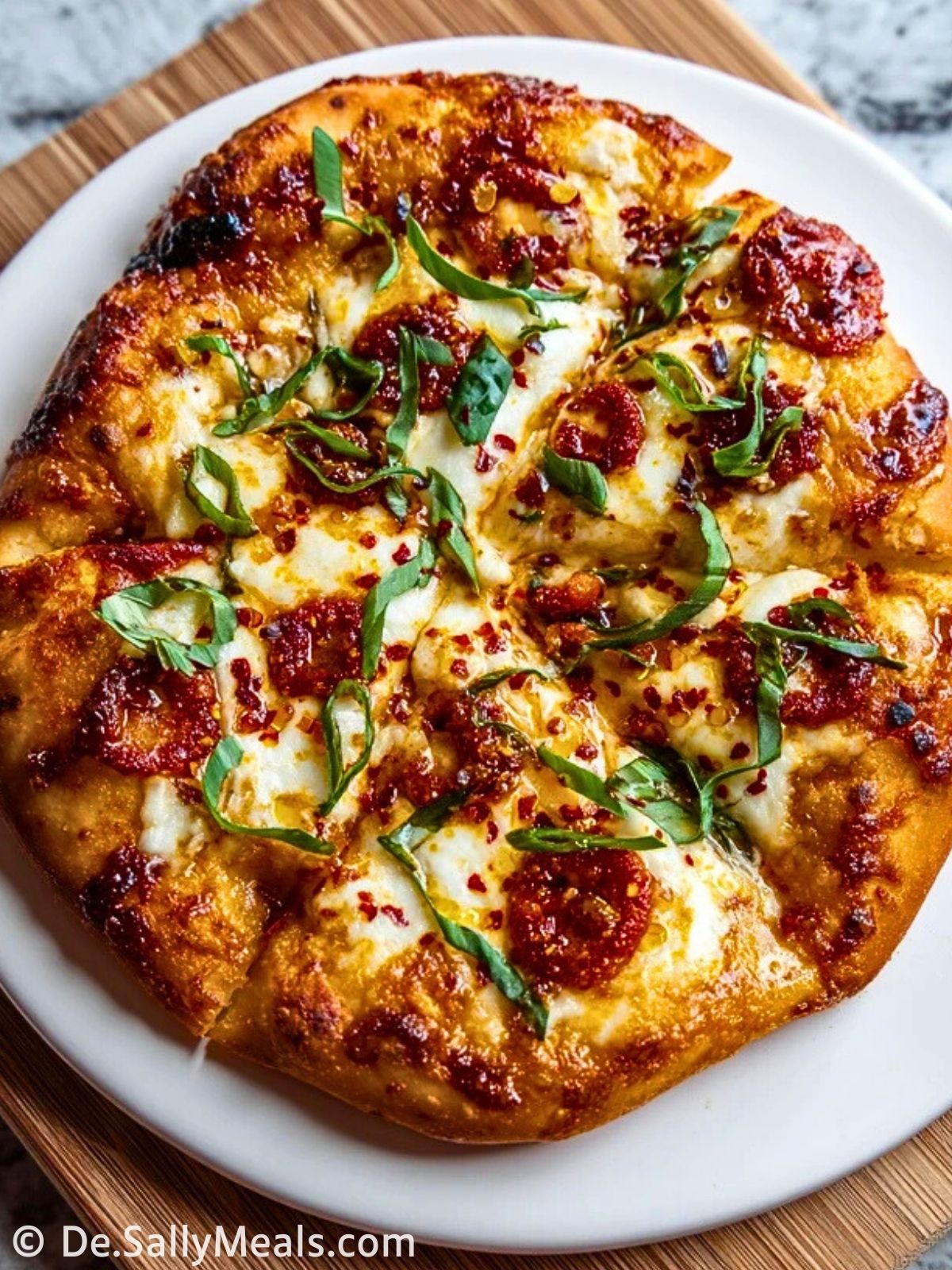 Backe die Pizza auf einem Pizzastein oder in einer Gusseisenpfanne für einen besonders knusprigen Boden.