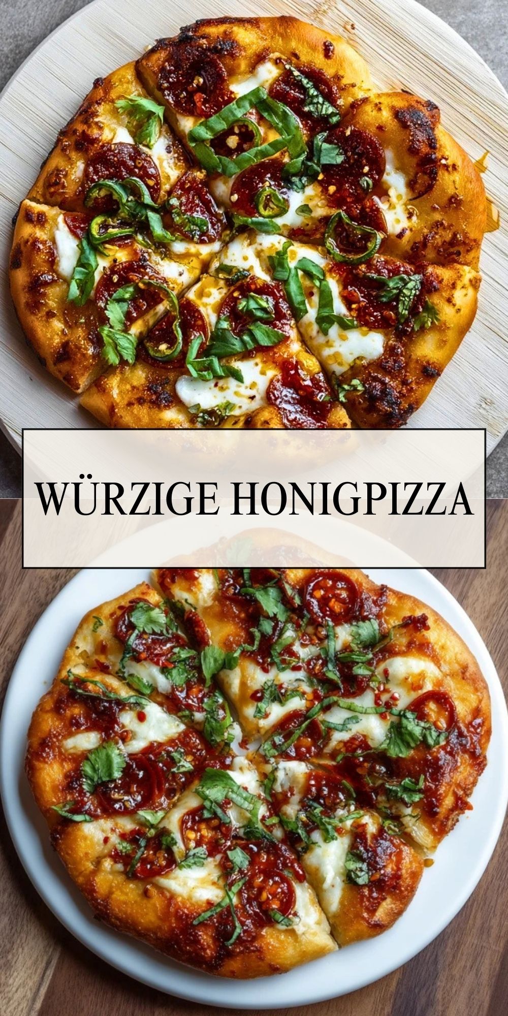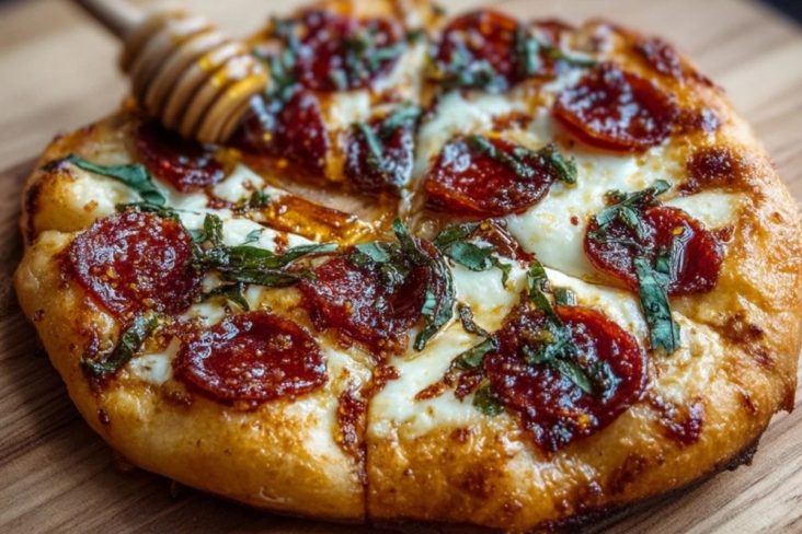 Würzige Honigpizza verbindet den knusprigen Pizzaboden mit schmelzendem Mozzarella, pikanter Peperoni-Salami und einem Hauch süßen Honigs. Perfekt für alle, die Kontraste lieben – einfach gemacht und ein echter Genuss!
