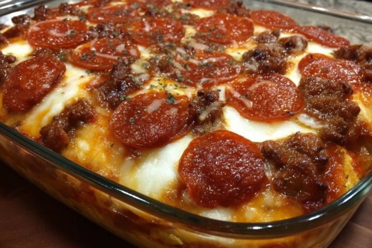 Ein herzhafter, käsiger Auflauf mit Hackfleisch, würziger Wurst, Peperoni, Tomatensauce und zart schmelzendem Käse. Dieses unkomplizierte Ofengericht ist perfekt für ein sättigendes Familienessen und bringt den beliebten Geschmack einer deftigen Pizza in Auflaufform auf den Tisch.