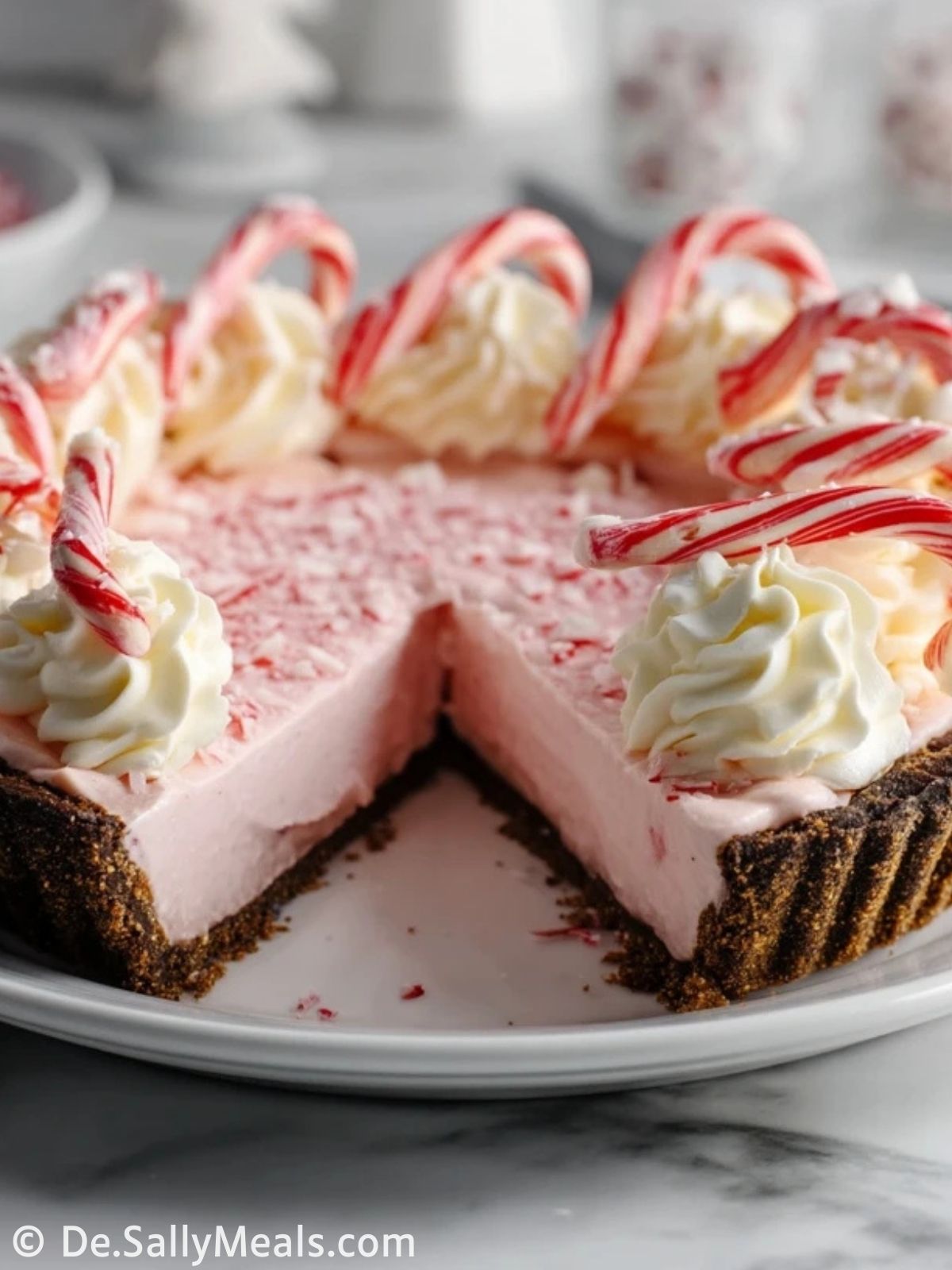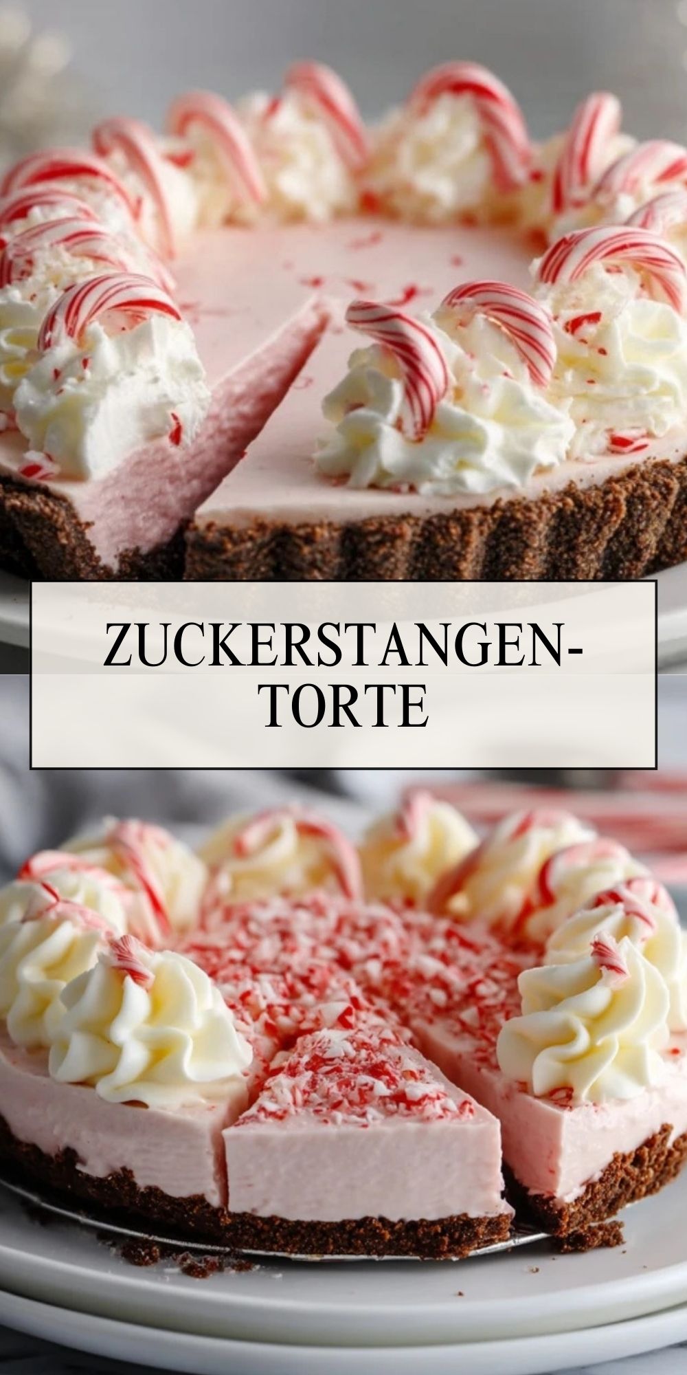 Diese Zuckerstangen-Torte ist ein festliches No-Bake-Dessert mit knusprigem Schokokeksboden, zarter Pfefferminz-Cremefüllung in zartem Rosa und einer luftigen Vanille-Sahnehaube, dekoriert mit knusprigen Zuckerstangen – perfekt für die Weihnachtszeit und alle, die frische Pfefferminze und cremige Torten lieben.